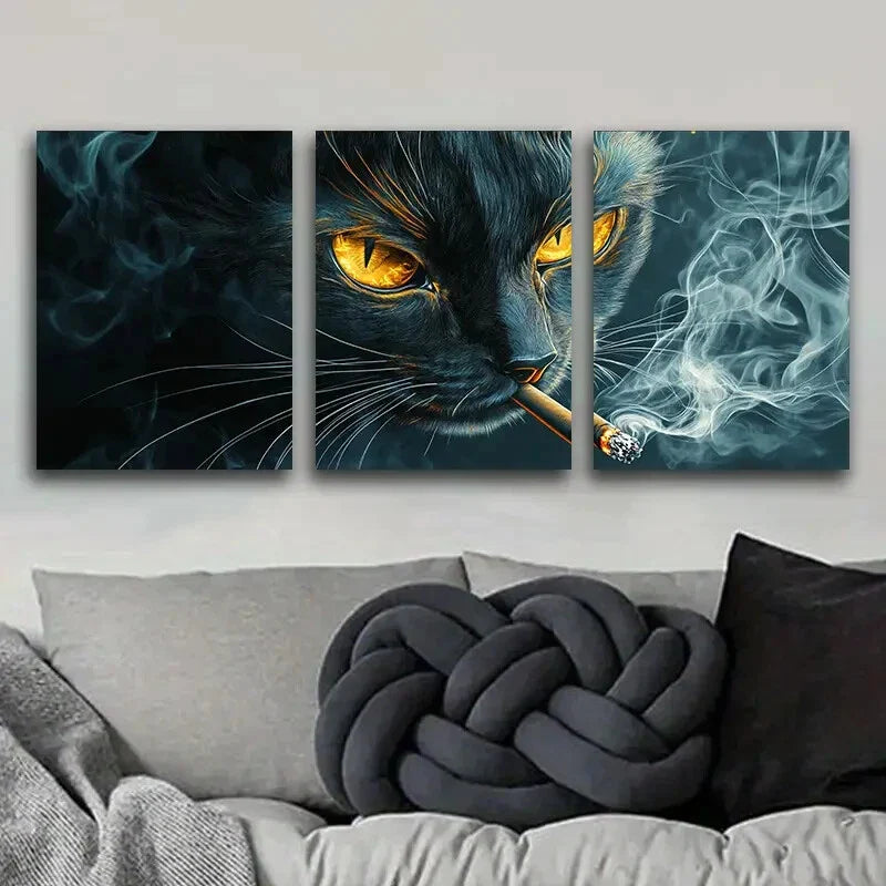 3pcs A Black Cat with Yellow Eyes Smoking Metal Print Ready to Hang Art