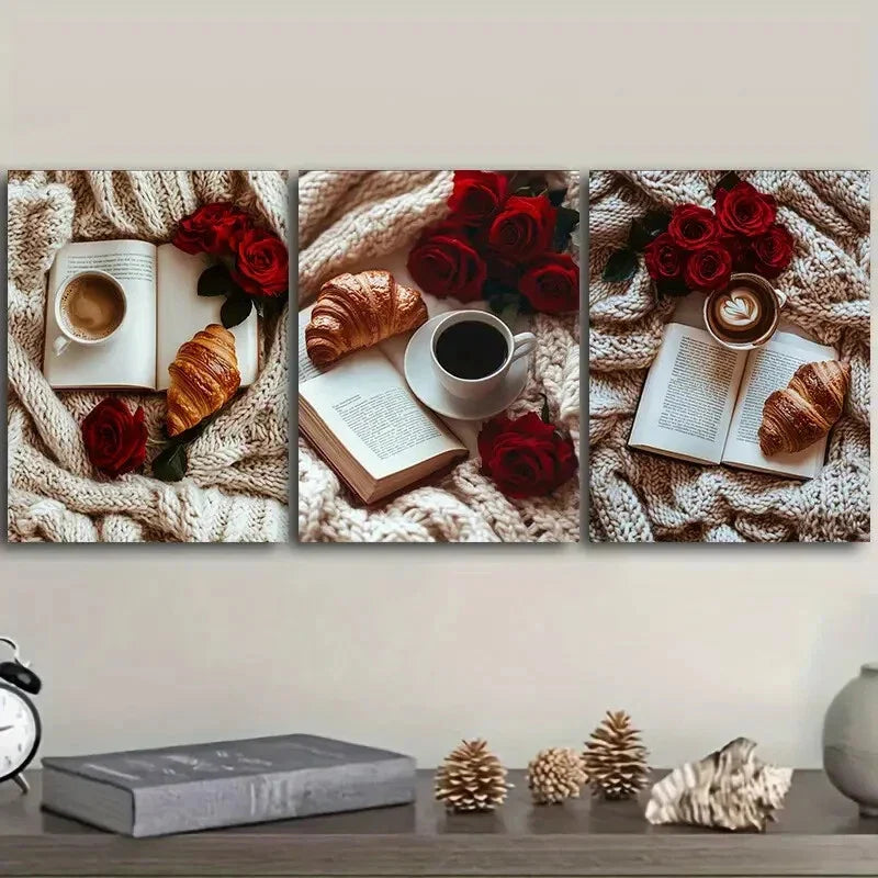 3pcs A book, red roses, bread Wall Art Set Canvas Framed 40x60cm - High Quality Print 100% Australian Made Wall Canvas Ready to Hang