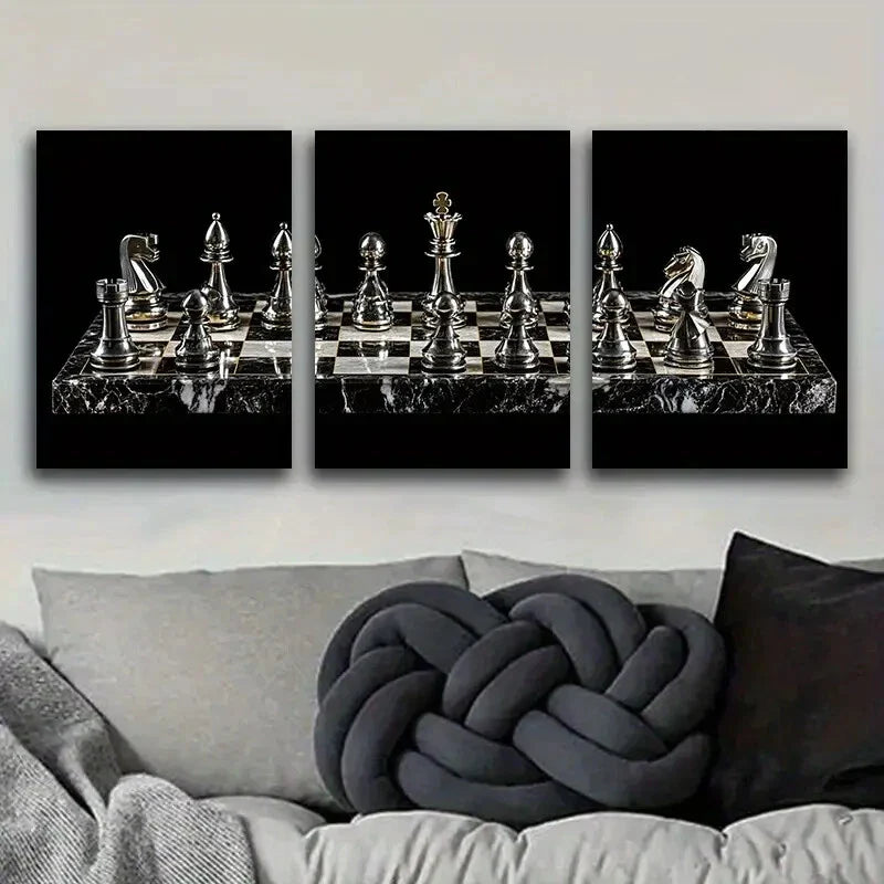3pcs A chess board with Silvery pieces on it Metal Print Ready to Hang Art