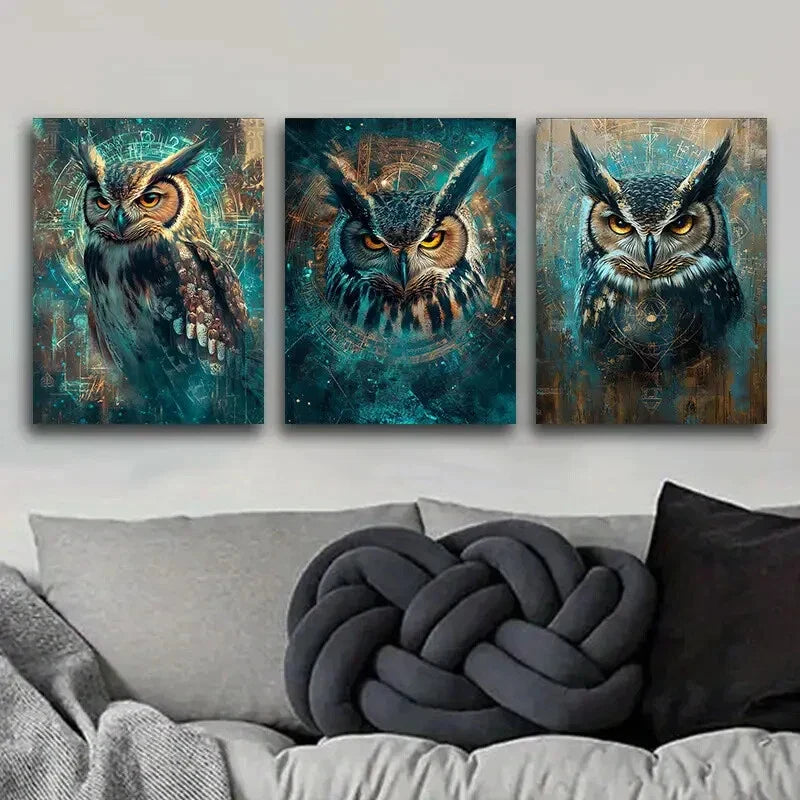 3pcs A mysterious owl Art Painting Metal Print Ready to Hang Art
