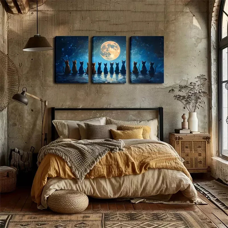 3pcs A Row Of Cats Looking Up At The Moon Wall Art Set Canvas Framed 40x60cm - High Quality Print 100% Australian Made Wall Canvas Ready to Hang