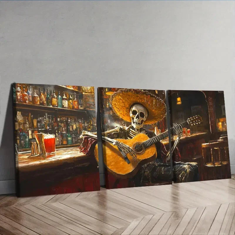 3pcs A skeleton playing guitar in a bar Wall Art Set Canvas Framed 40x60cm - High Quality Print 100% Australian Made Wall Canvas Ready to Hang