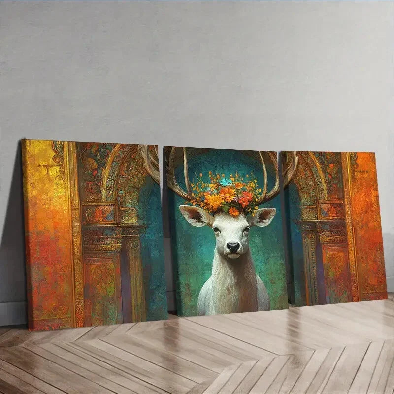 3pcs A white deer with flowers on its head Wall Art Set Canvas Framed 40x60cm - High Quality Print 100% Australian Made Wall Canvas Ready to Hang
