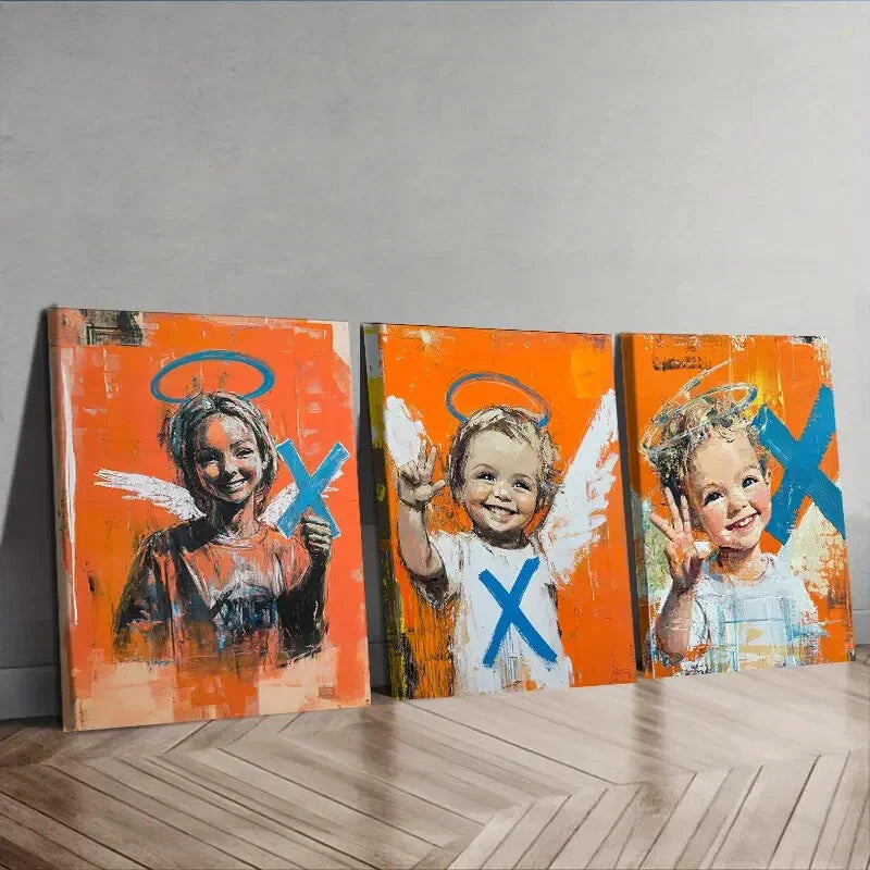 3pcs Abstract Angel Trio, Orange & Blue Accent Wall Art Set Canvas Framed 40x60cm - High Quality Print 100% Australian Made Wall Canvas Ready to Hang