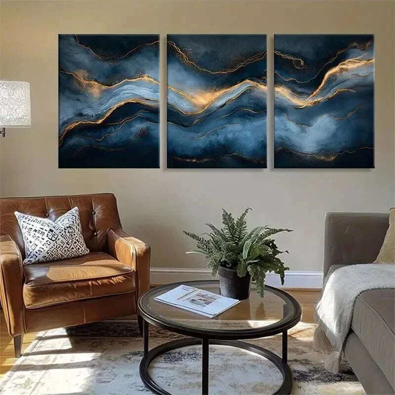 3pcs Abstract Blue and Golden Marble-Inspired Wall Art Set Canvas Framed 40x60cm - High Quality Print 100% Australian Made Wall Canvas Ready to Hang