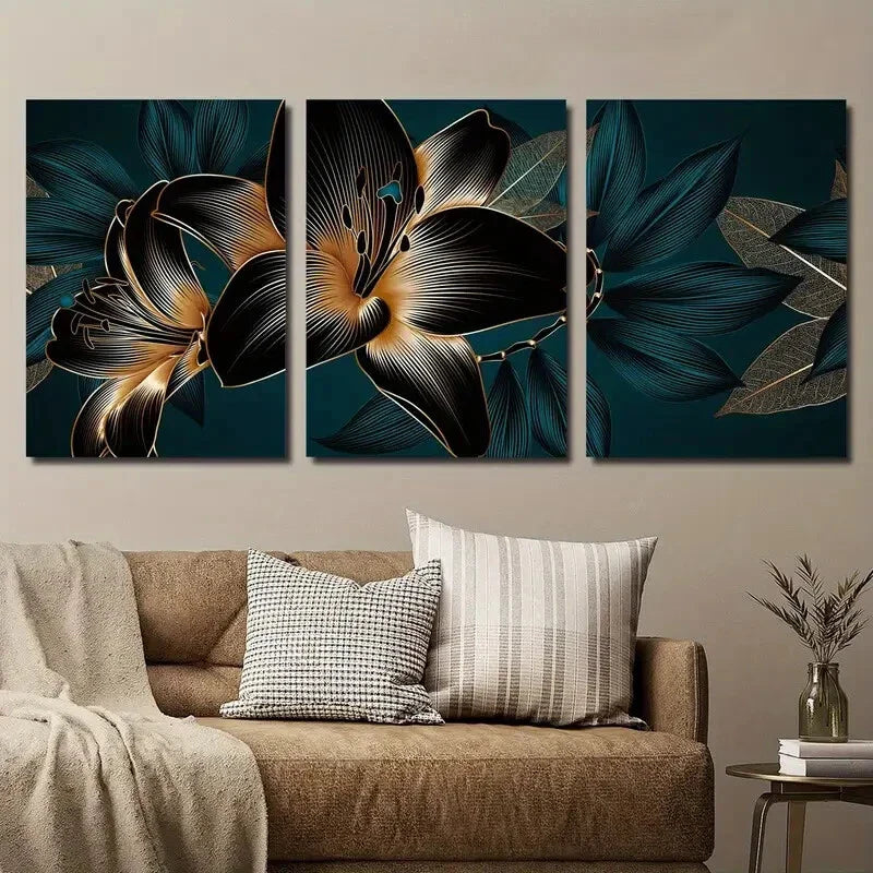 3pcs Abstract Botanical Flower Pattern Black Metal Print Ready to Hang Art