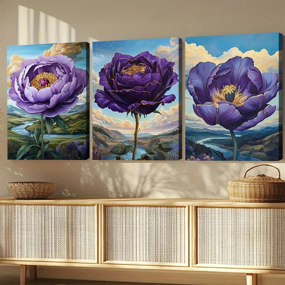 3pcs Abstract Charming Purple Flowers Blue Sky Wall Art Set Canvas Framed 40x60cm - High Quality Print 100% Australian Made Wall Canvas Ready to Hang