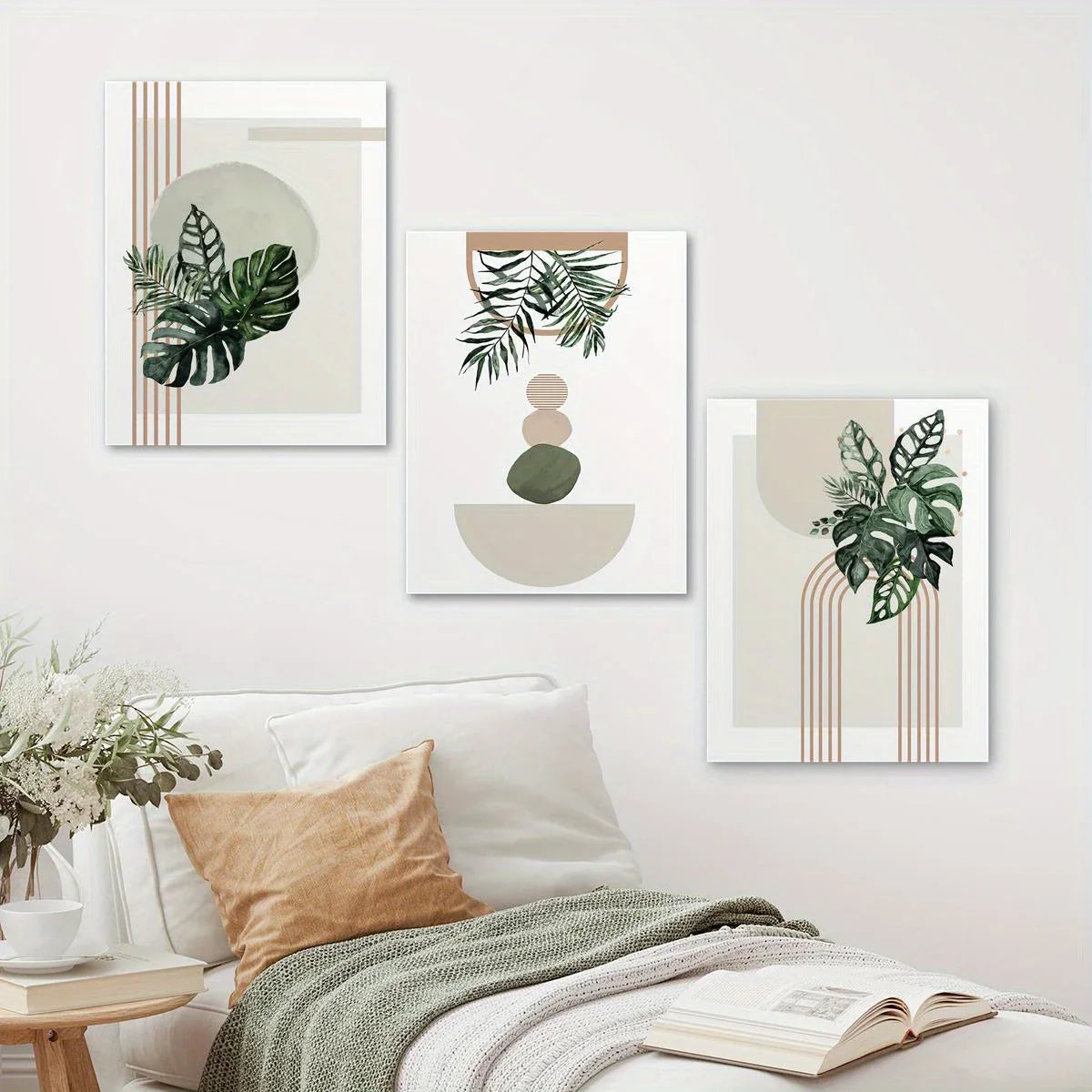 3pcs Abstract Geometric Lines & Watercolor Leaves Metal Print Ready to Hang Art