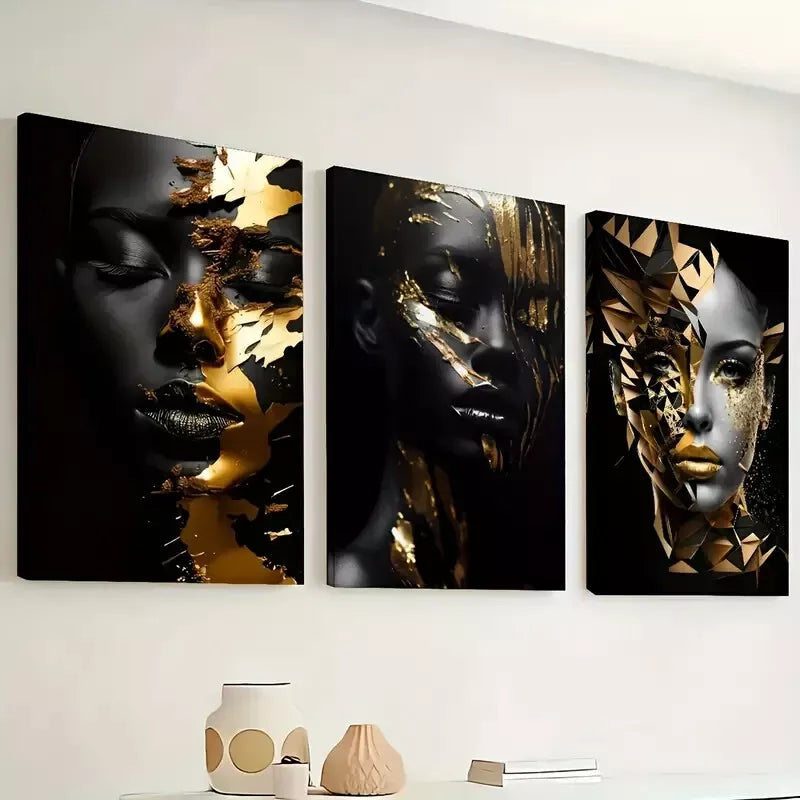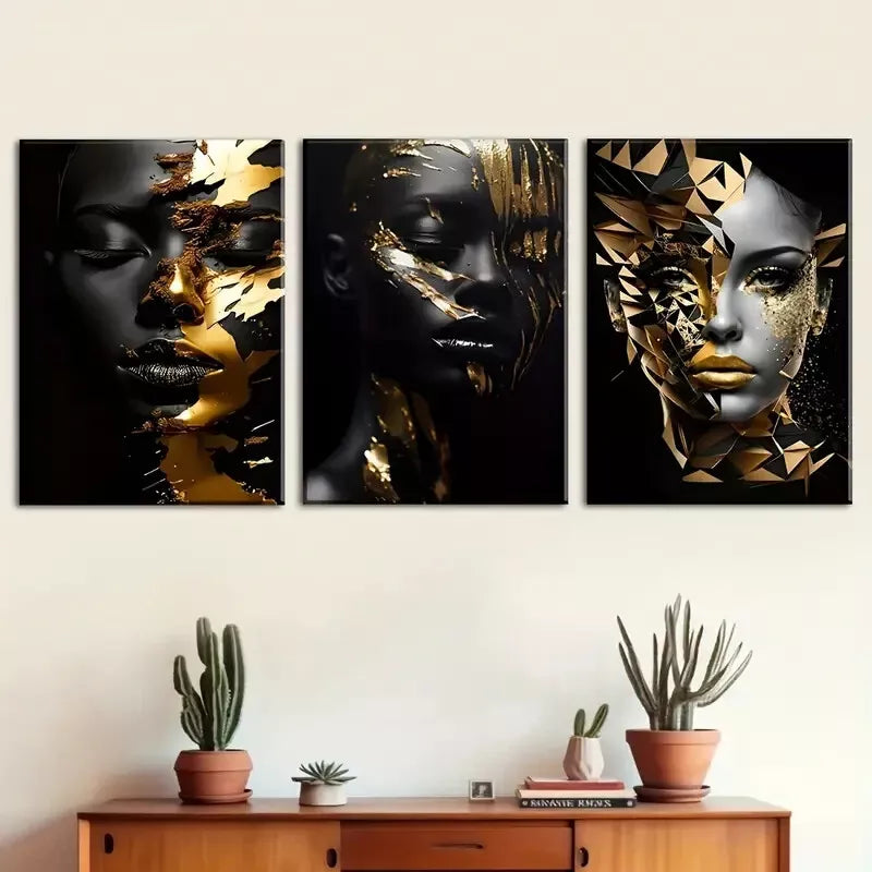 3pcs Abstract Golden Decoration of African Women Wall Art Set Canvas Framed 40x60cm - High Quality Print 100% Australian Made Wall Canvas Ready to Hang