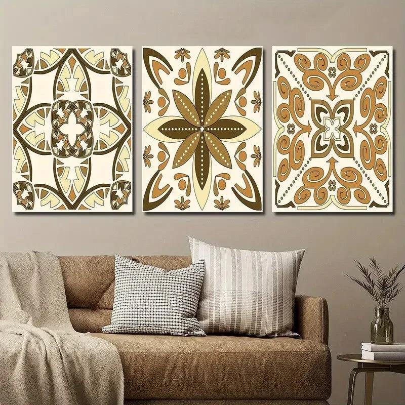 3pcs Abstract Golden Mexican Talavera Tiles Metal Print Ready to Hang Art