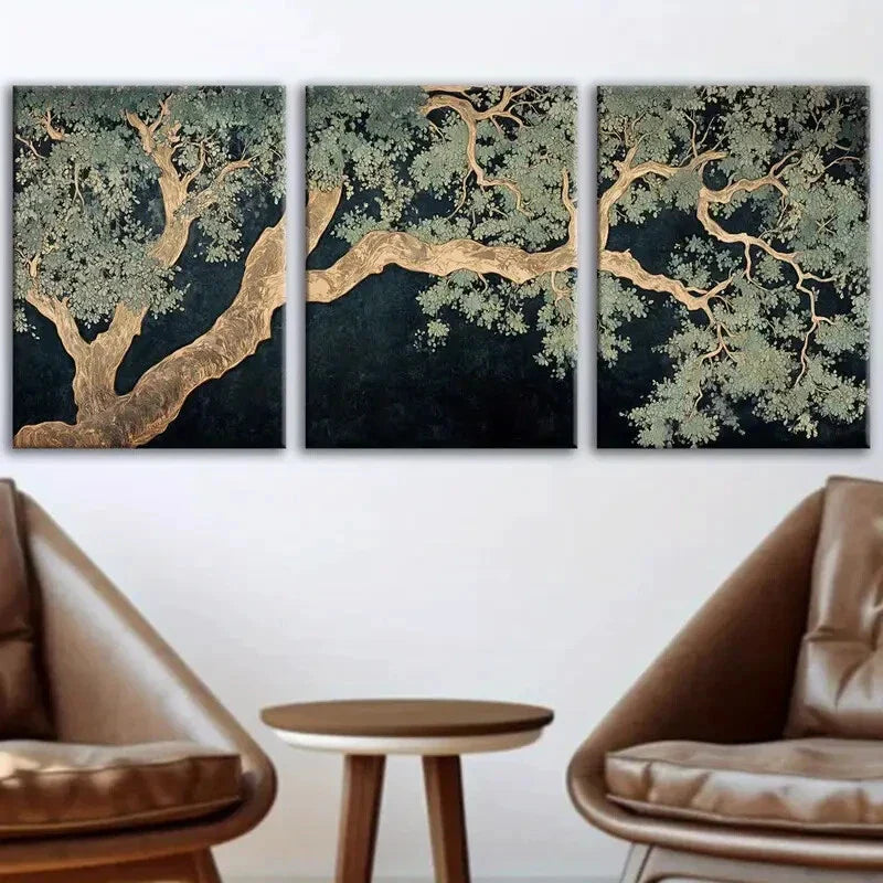 3pcs Abstract Green and Brown Tree Metal Print Ready to Hang Art
