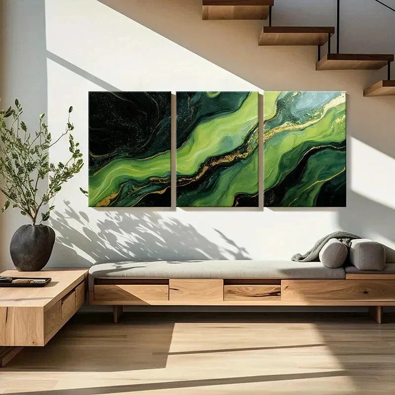 3pcs Abstract Green & Golden Fluid Art Metal Print Ready to Hang Art