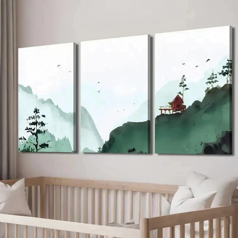 3pcs Abstract Green Landscape with Red Bench Wall Art Set Canvas Framed 40x60cm - High Quality Print 100% Australian Made Wall Canvas Ready to Hang