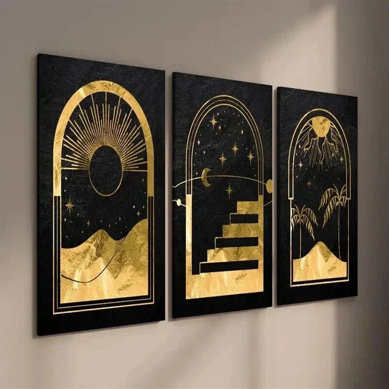3pcs Abstract Mystical Golden Moon & Sun Wall Art Set Canvas Framed 40x60cm - High Quality Print 100% Australian Made Wall Canvas Ready to Hang
