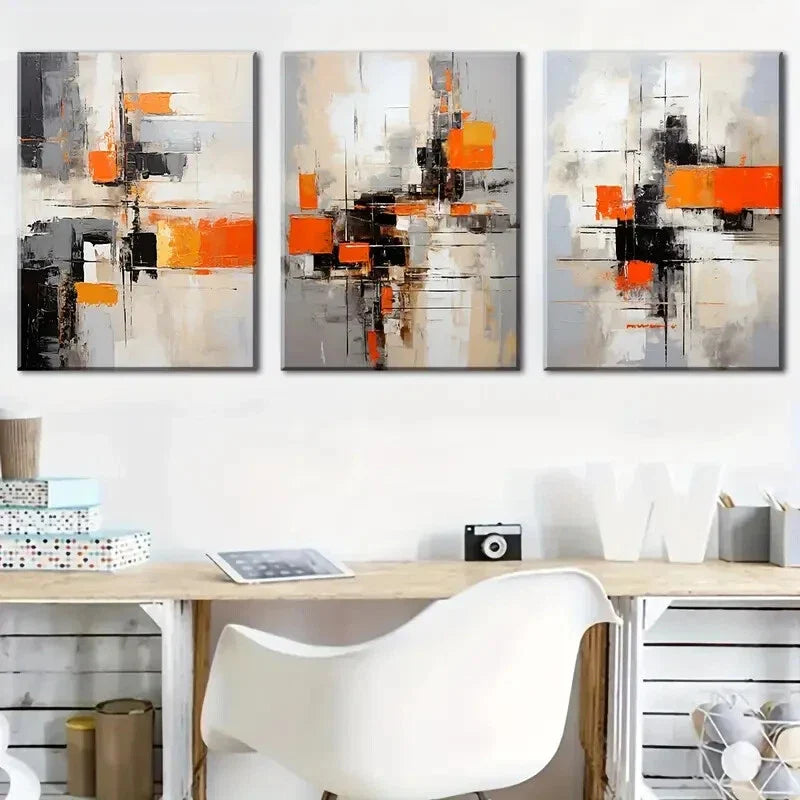 3pcs Abstract Orange Block Geometric Lines Metal Print Ready to Hang Art
