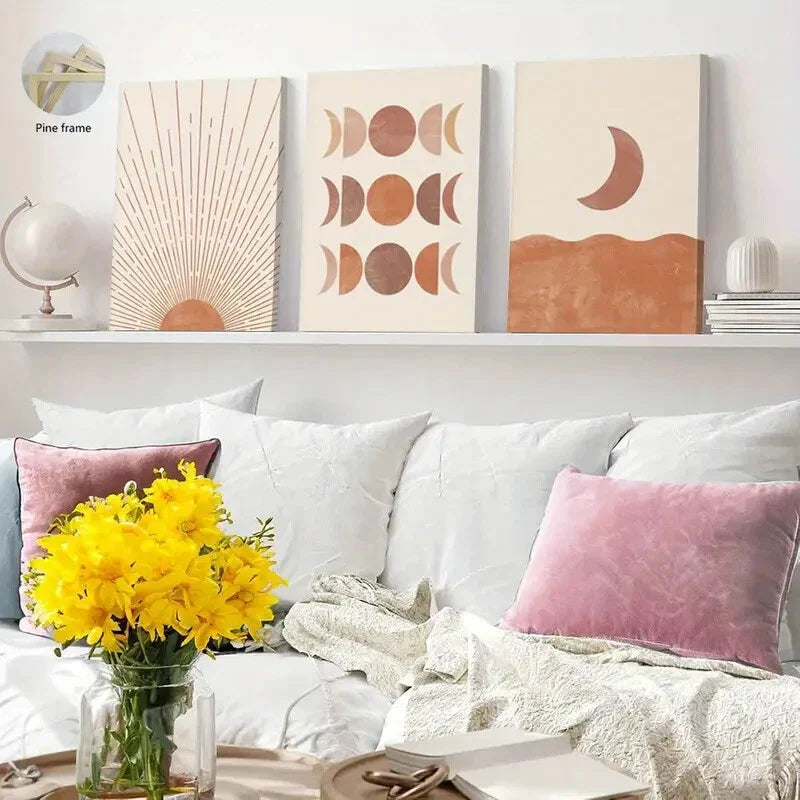 3pcs Abstract Pink Sunset & Moon Phases Wall Art Set Canvas Framed 40x60cm - High Quality Print 100% Australian Made Wall Canvas Ready to Hang