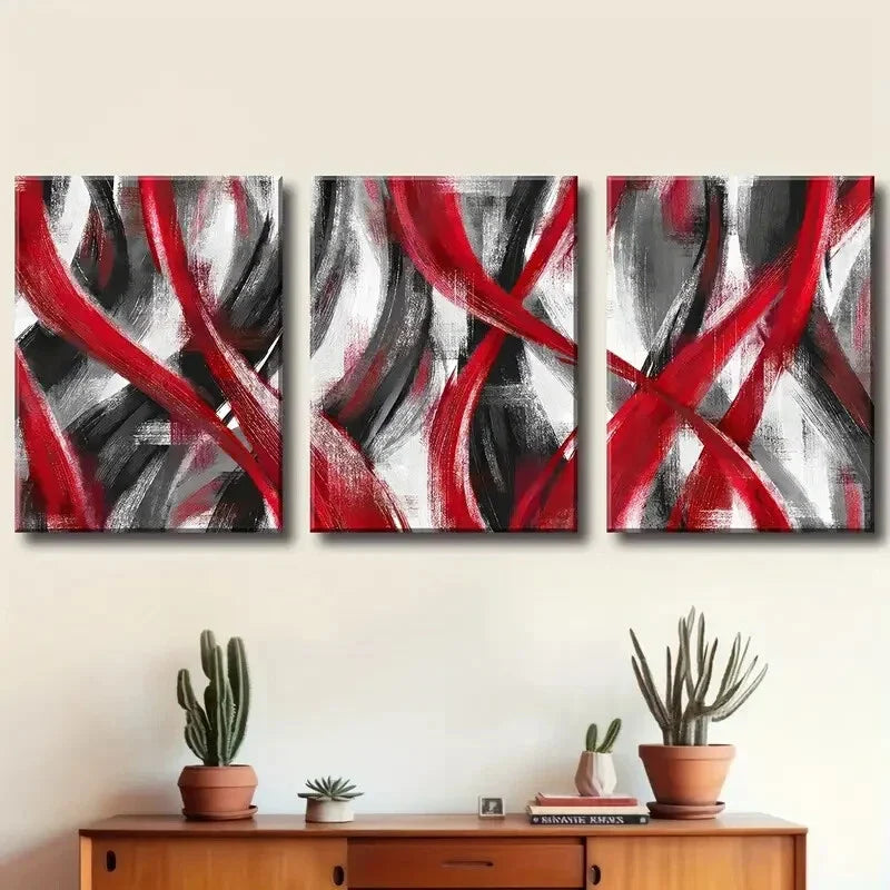 3pcs Abstract Red And Black Geometric Lines Metal Print Ready to Hang Art