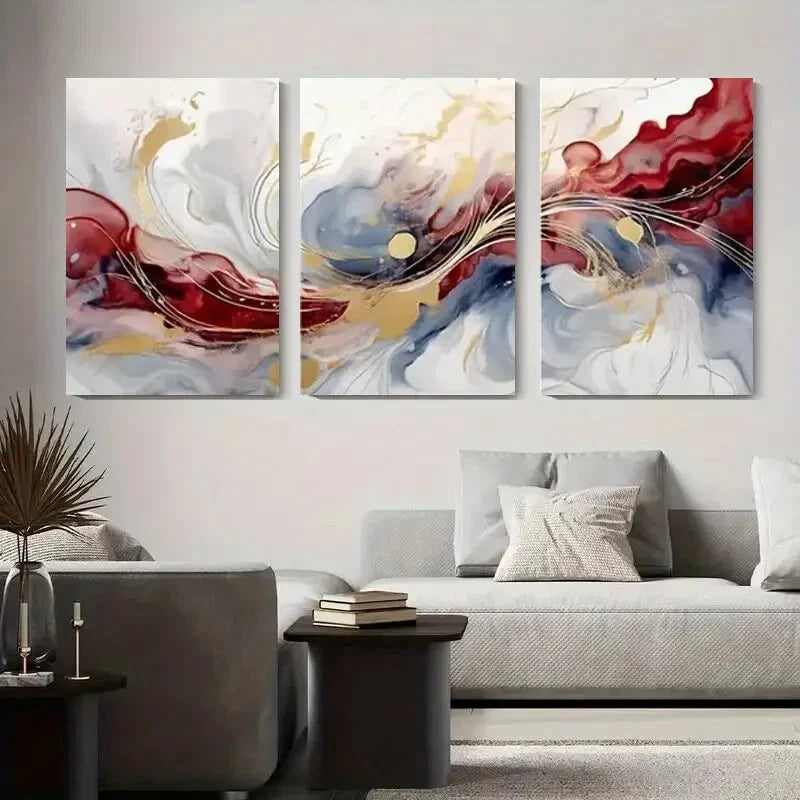 3pcs Abstract Red, Blue, and Golden Fluid Metal Print Ready to Hang Art