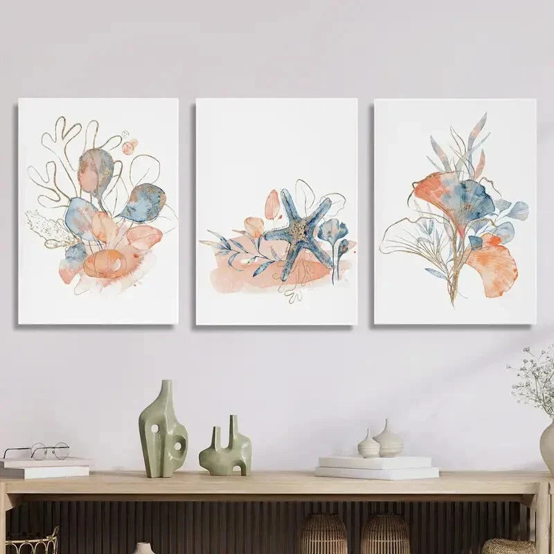 3pcs Abstract seashell coral seaweed art painting Metal Print Ready to Hang Art