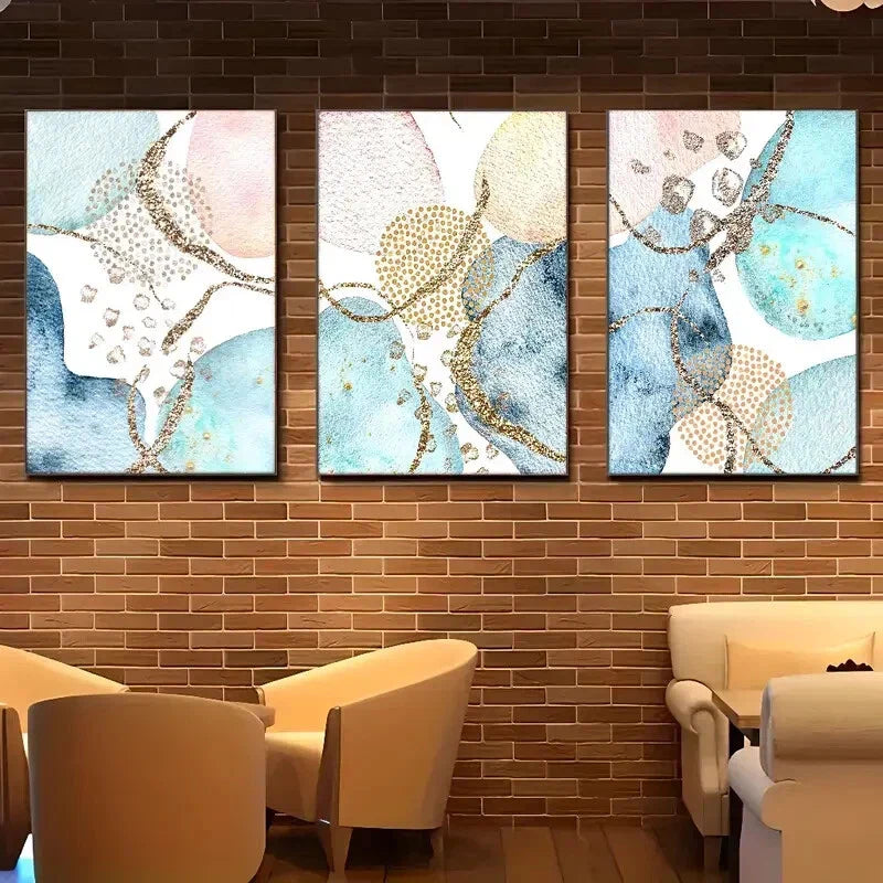 3pcs Abstract Vibrant Blue & Golden Geometric Metal Print Ready to Hang Art