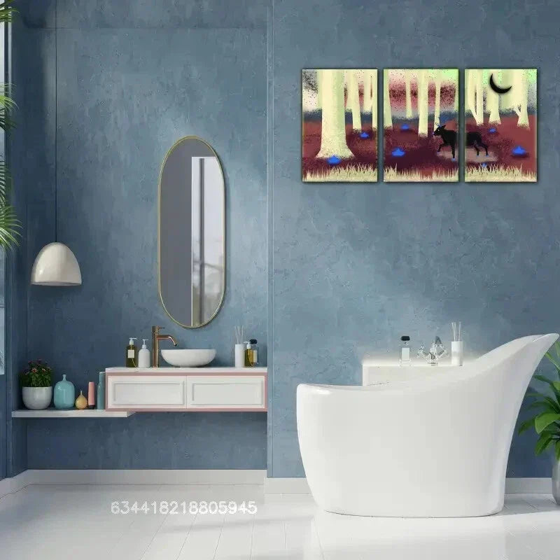 3pcs Accent, Sika deer in the forest, the moon, Metal Print Ready to Hang Art