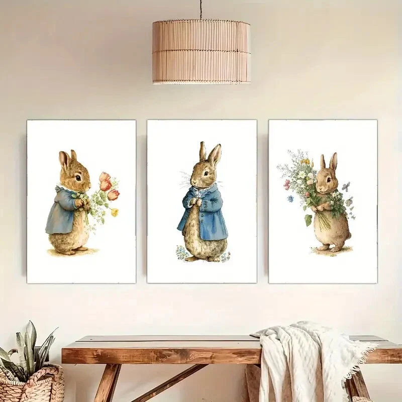 3pcs Adorable Bunny And Floral Artwork Metal Print Ready to Hang Art