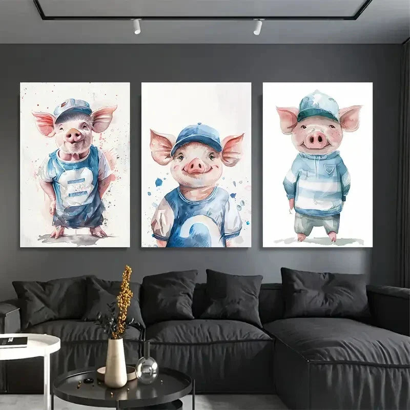 3pcs Adorable Cartoon Pig Blue & Pink Metal Print Ready to Hang Art