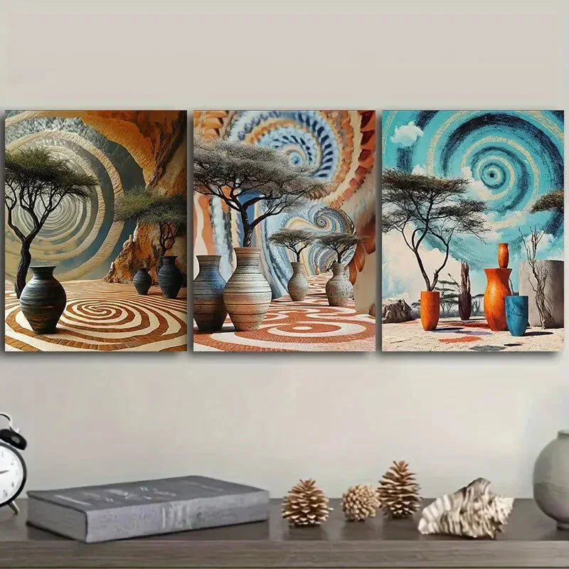 3pcs African Pots And Vases Painting Metal Print Ready to Hang Art