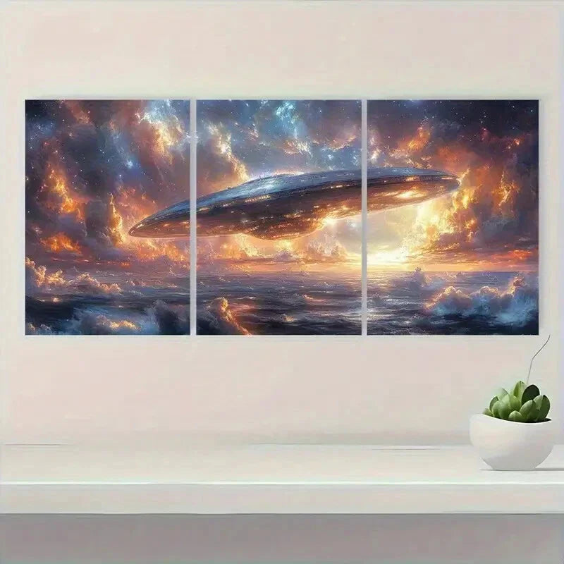 3pcs Alien Spacecraft Vibrant Cosmic Metal Print Ready to Hang Art