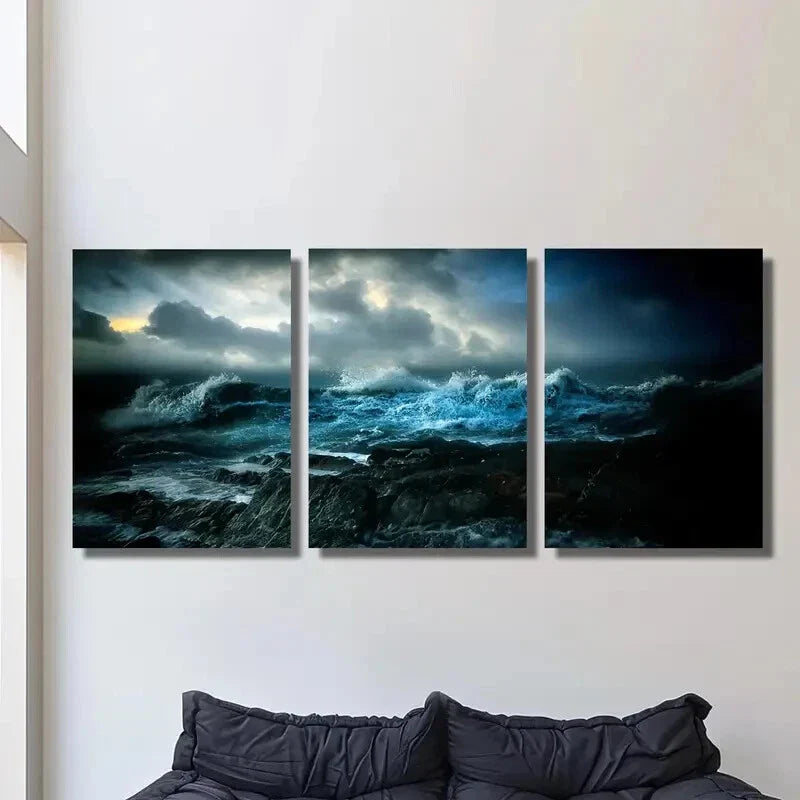 3pcs , Amazing Ocean Waves at Night, Deep Blue Metal Print Ready to Hang Art