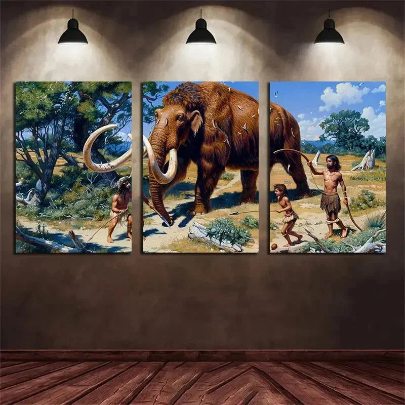 3pcs Ancient Human And Mammoth Hunting Scenes Metal Print Ready to Hang Art