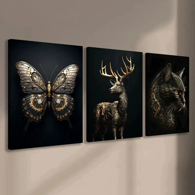 3pcs Animal Butterfly Cat Gold Black Modern Deer Wall Art Set Canvas Framed 40x60cm - High Quality Print 100% Australian Made Wall Canvas Ready to Hang