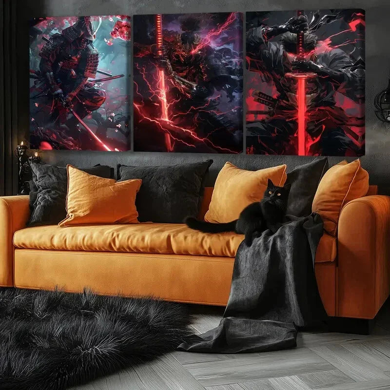 3pcs Anime Comic Vivid Color Samurai Thunder Red Wall Art Set Canvas Framed 40x60cm - High Quality Print 100% Australian Made Wall Canvas Ready to Hang
