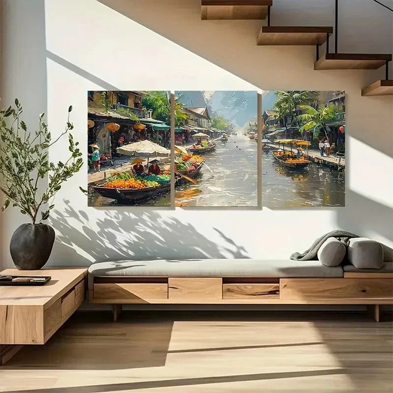 3pcs Asian Vibrant Floating Market Scenery Metal Print Ready to Hang Art