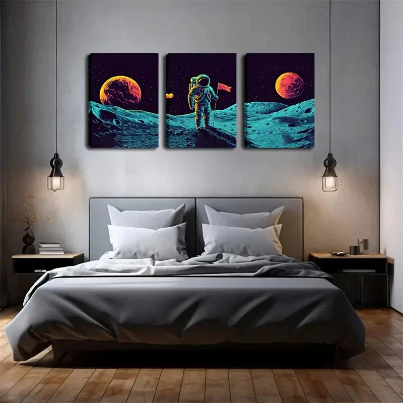 3pcs Astronaut Landing on Moon Triptych Wall Art Set Canvas Framed 40x60cm - High Quality Print 100% Australian Made Wall Canvas Ready to Hang