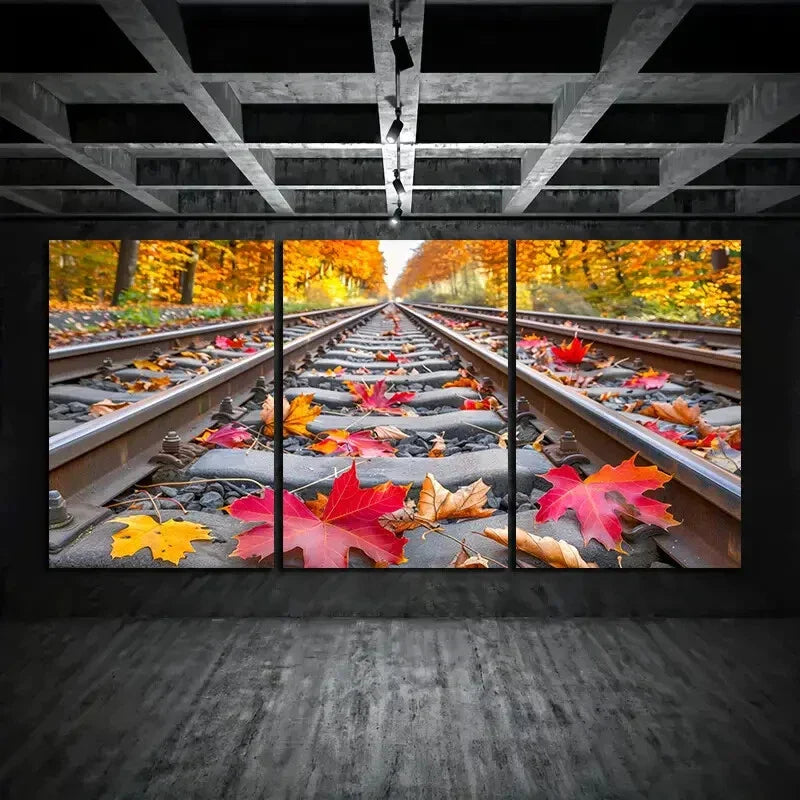 3pcs Autumn Leaves on Old Railway Track Metal Print Ready to Hang Art