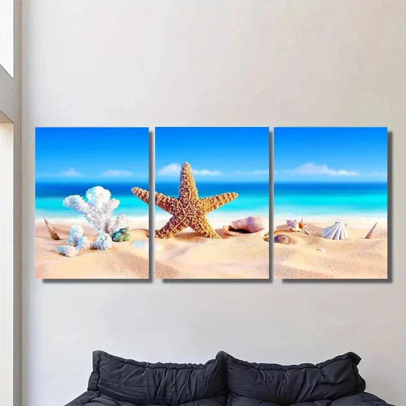 3pcs Beach Scene Starfish & Seashells Triptych Metal Print Ready to Hang Art