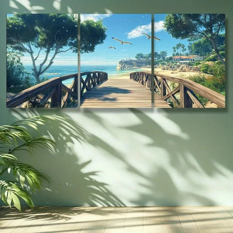 3pcs Beach Scene with Wooden Bridge Palm TreesWall Art Set Canvas Framed 40x60cm - High Quality Print 100% Australian Made Wall Canvas Ready to Hang