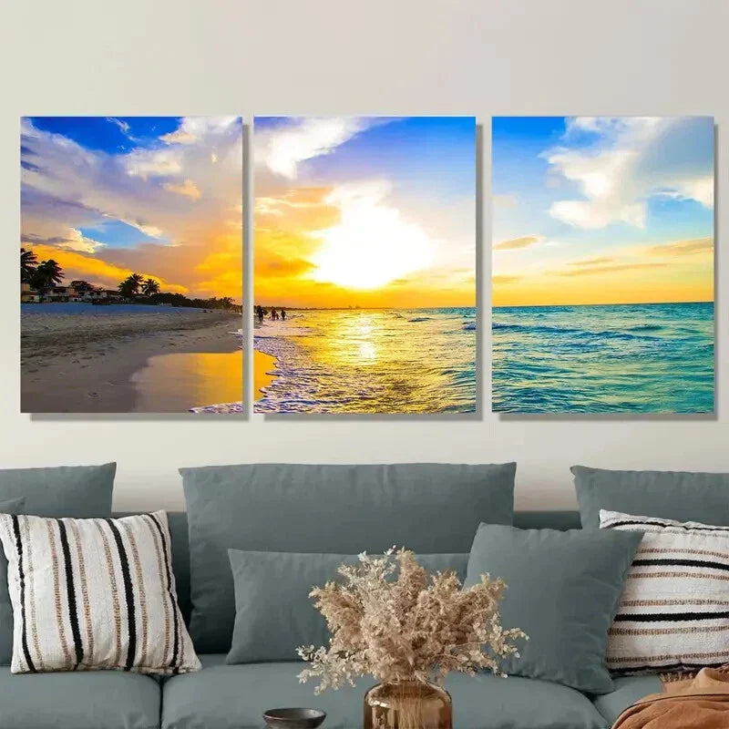 3pcs Beach Sunset Triptych Vibrant Orange & Blue Metal Print Ready to Hang Art