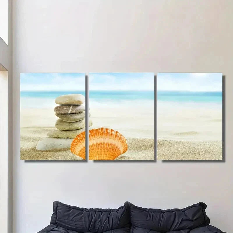 3pcs Beach Zen Stone Stack and Seashell Metal Print Ready to Hang Art