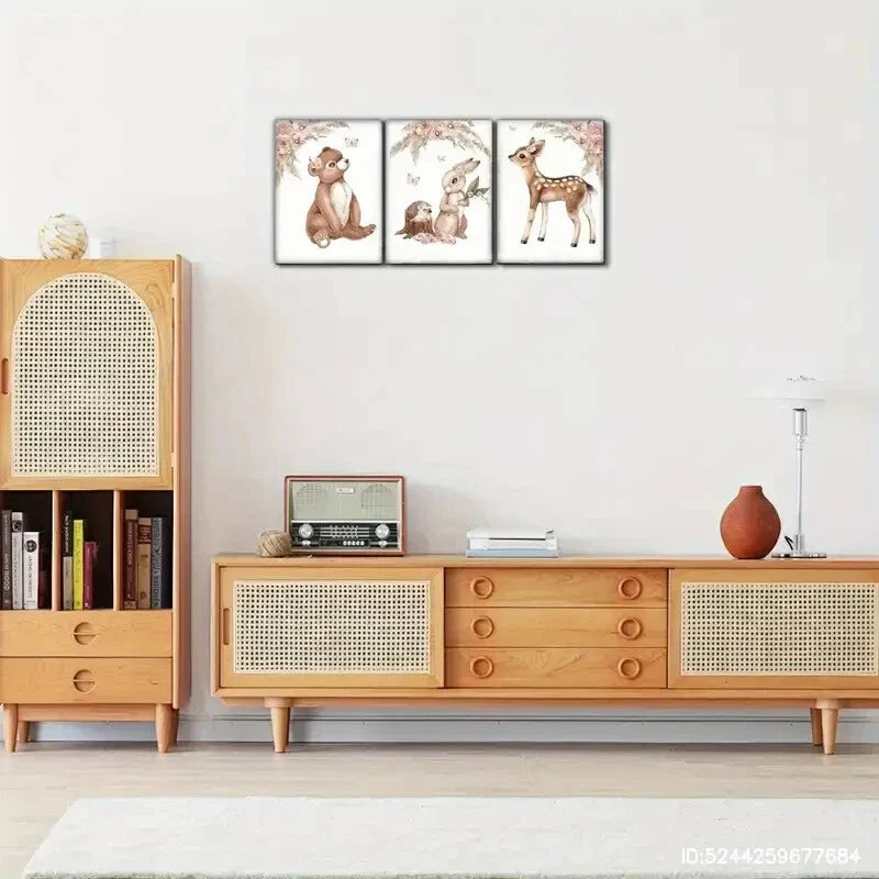 3pcs Bear Rabbit Deer, Butterfly Floral Art Metal Print Ready to Hang Art