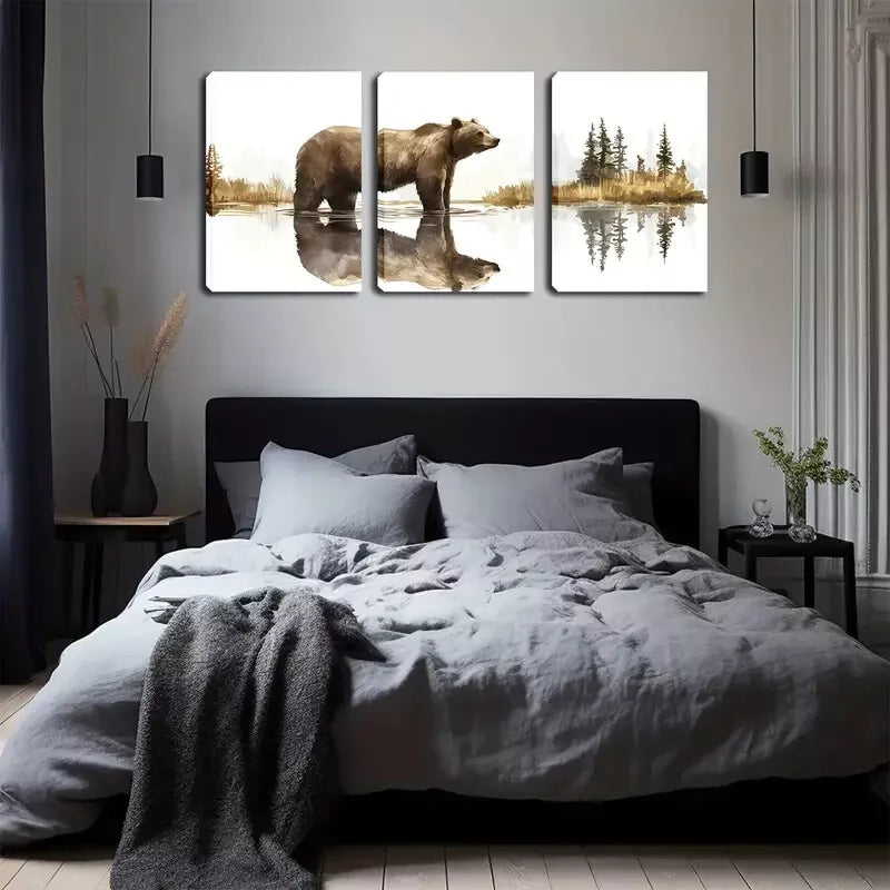 3pcs Bear Standing on The Lake Wall Art Set Canvas Framed 40x60cm - High Quality Print 100% Australian Made Wall Canvas Ready to Hang