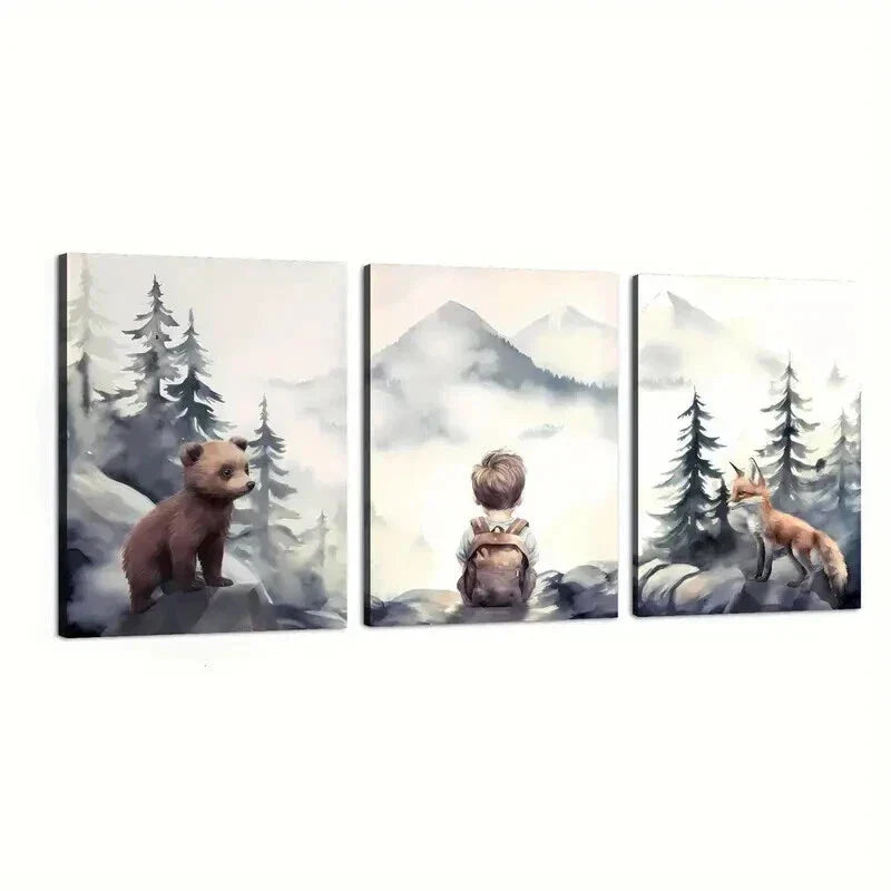 3pcs Bears Forest Wildlife & Mountain Peaks Wall Art Set Canvas Framed 40x60cm - High Quality Print 100% Australian Made Wall Canvas Ready to Hang
