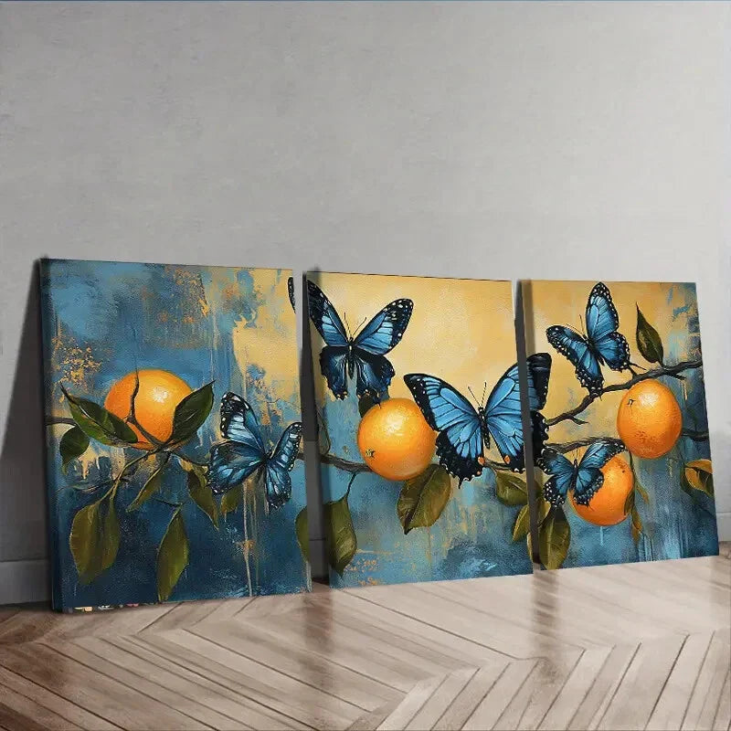 3pcs Beautiful Blue Butterflies & Orange Perfect Wall Art Set Canvas Framed 40x60cm - High Quality Print 100% Australian Made Wall Canvas Ready to Hang