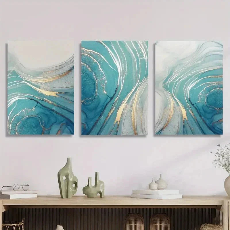 3pcs Beautiful blue light luxury abstract golden Metal Print Ready to Hang Art