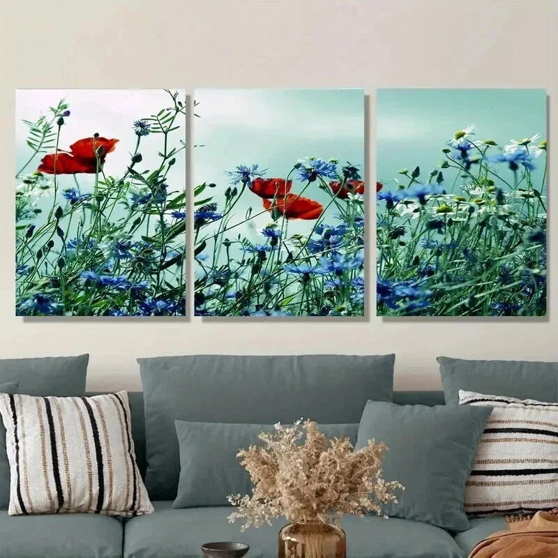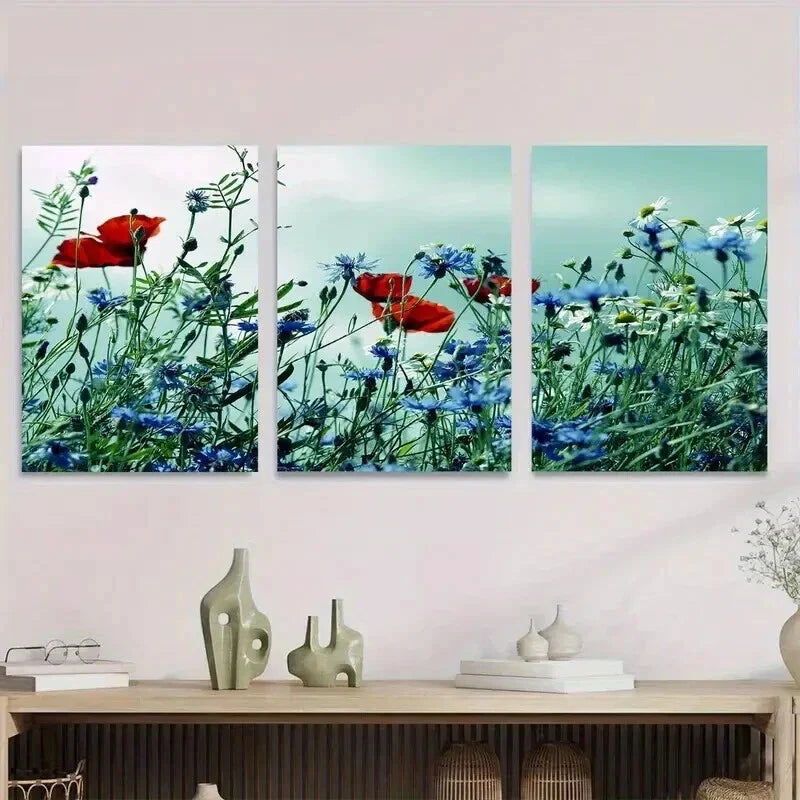 3pcs Beautiful Red Poppy and Blue Flower Wall Art Set Canvas Framed 40x60cm - High Quality Print 100% Australian Made Wall Canvas Ready to Hang