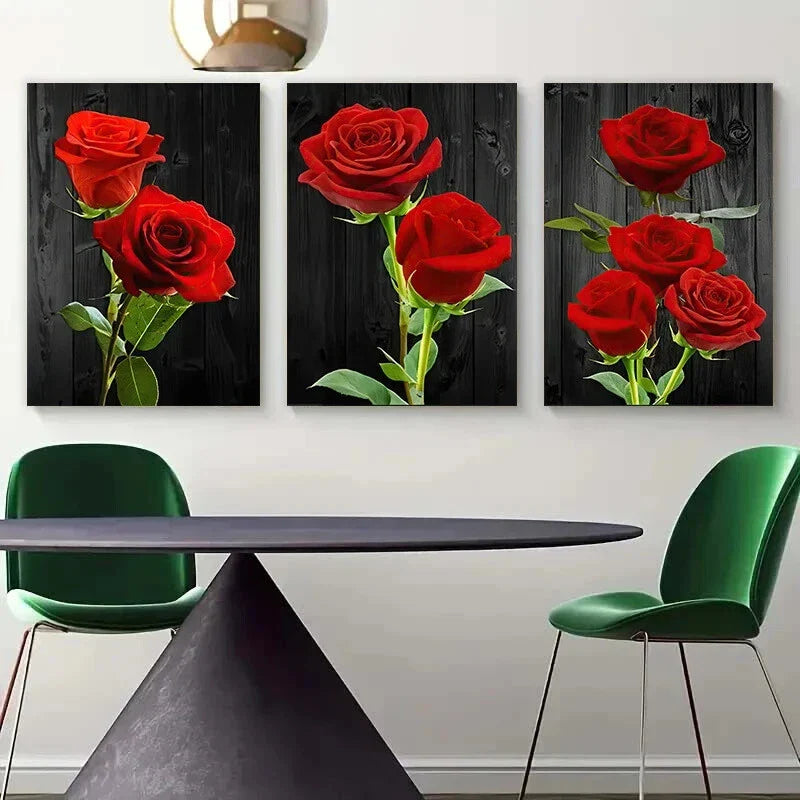 3pcs Beautiful Red Roses Green Leaves Metal Print Ready to Hang Art
