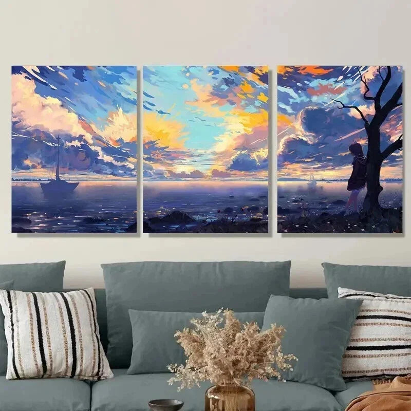 3pcs Beautiful Sunset Seascape Blue Sky & Ocean Wall Art Set Canvas Framed 40x60cm - High Quality Print 100% Australian Made Wall Canvas Ready to Hang