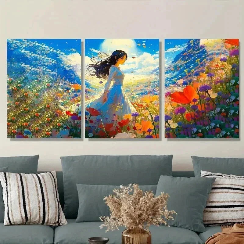 3pcs Beautiful Woman In Flower Vibrant Landscape Wall Art Set Canvas Framed 40x60cm - High Quality Print 100% Australian Made Wall Canvas Ready to Hang