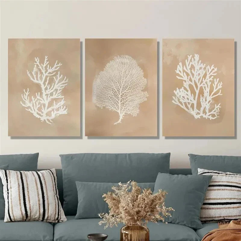 3pcs Beige coral art, seaweed botanical painting, Metal Print Ready to Hang Art